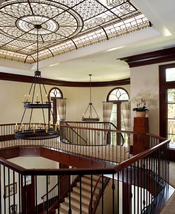 Natural light is the best type of light for opening up the foyer and making it seem bigger and more spacious. A large-scale leaded glass skylight commands attention and illuminates the stairwell with the light making